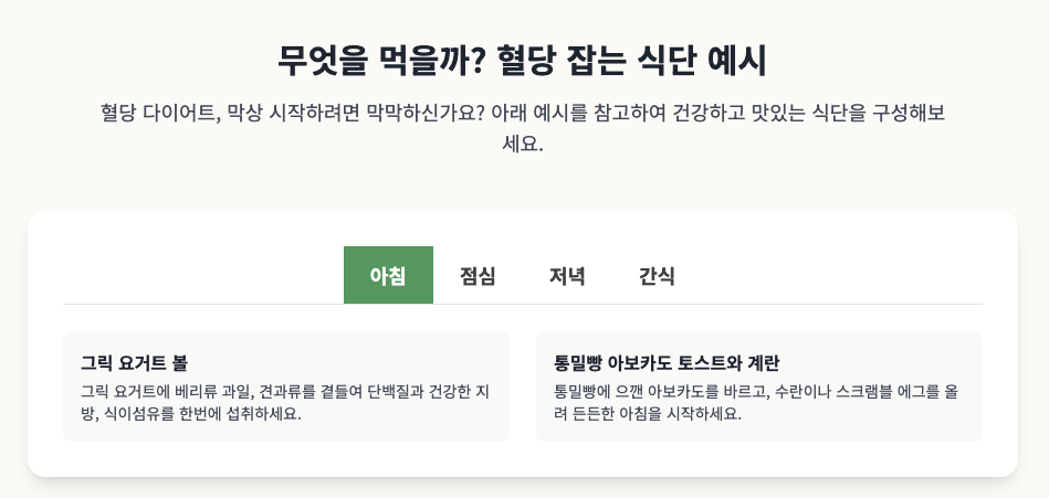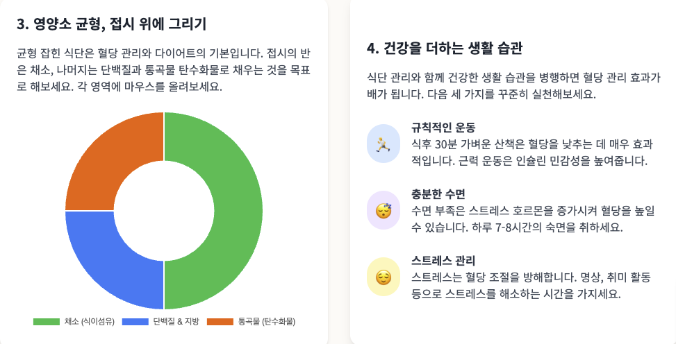 제가 준비한 파일은 스마트 혈당 다이어트 가이드입니다. 이 가이드는 혈당 다이어트의 핵심 원리를 쉽게 이해하고 바로 실천할 수 있도록,보여 드리며 대화형 차트와 다이어그램, 그리고 실용적인 식단 예시를 포함하고 있습니다. 복잡한 정보는 시각적으로 단순화하여 사용자가 혈당 관리의 중요성을 직관적으로 파악하고, 자신의 식단을 효과적으로 구성하는 데 도움을 줄 것입니다.